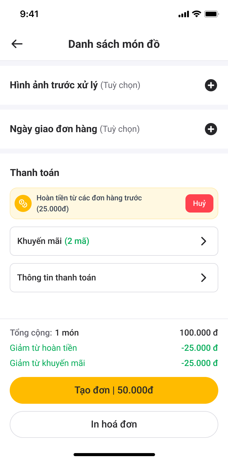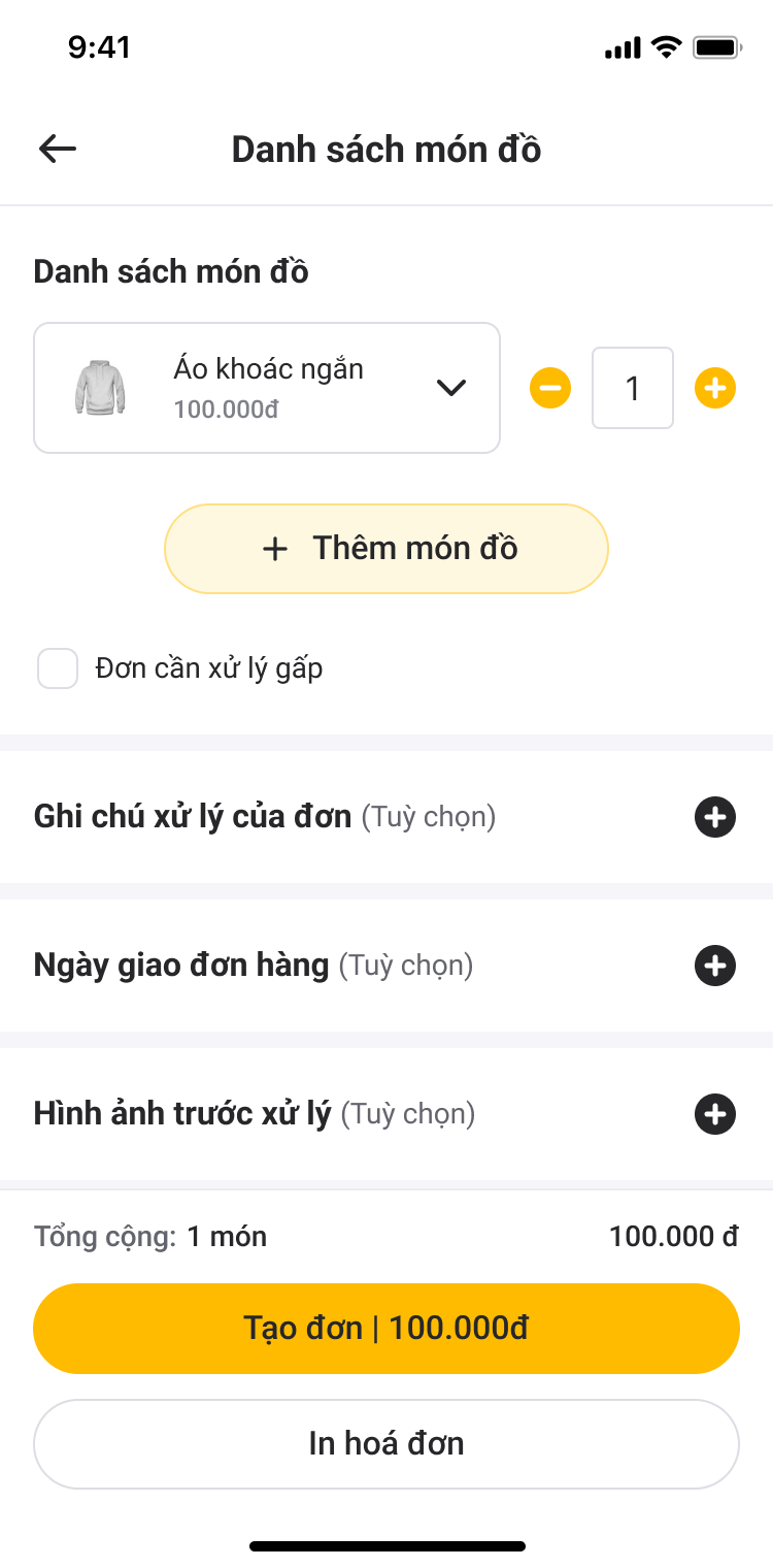 Lên đơn nhanh, chụp hình đồ trước khi xử lý, ghi chú yêu cầu xử lý của khách và theo dõi từng đơn, từng món theo từng công đoạn giặt