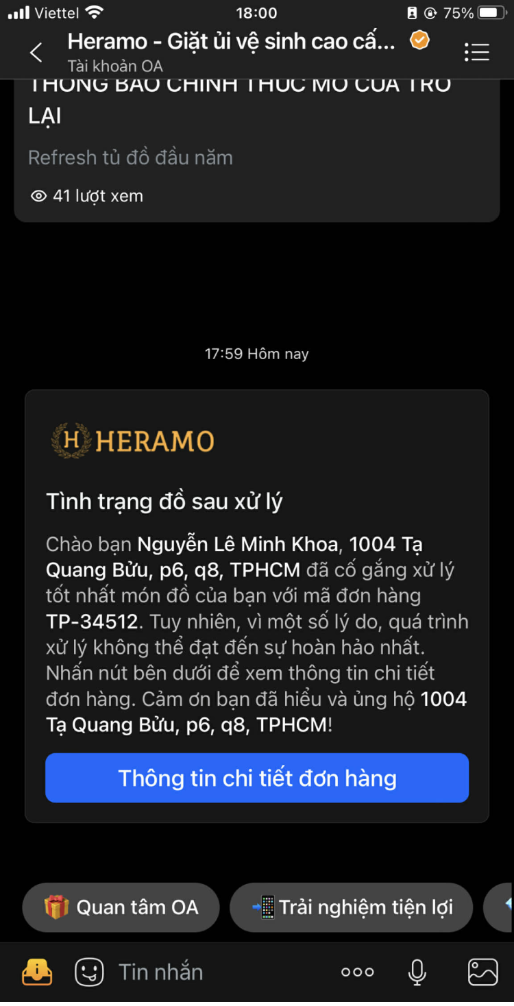 Khách hàng có thể theo dõi đơn hàng trực tuyến (website), được thông báo vấn đề trước khi xử lý, nhận thông tin tự động khi đồ hoàn tất (Zalo, SMS), xác nhận giao đúng người bằng mã OTP,… etc